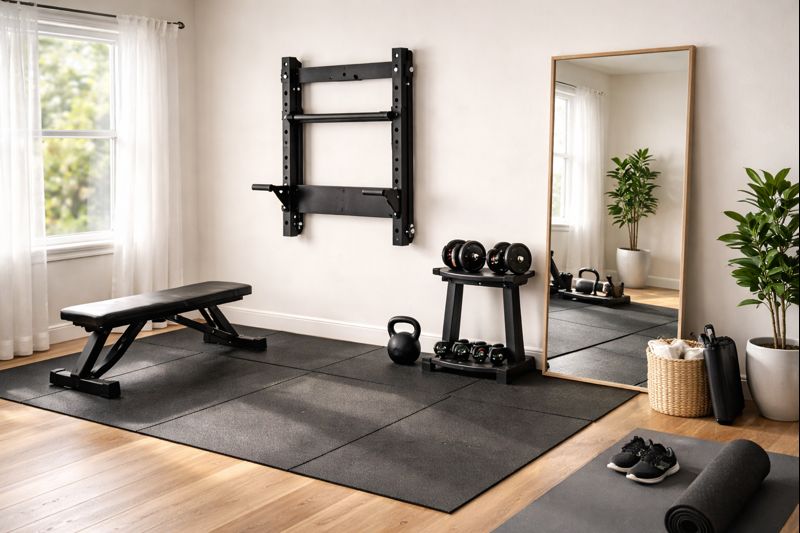 - Mirrors: This isn’t vanity; it’s depth. Covering one wall with frameless mirrors (you can buy “gym mirror kits” or use bathroom vanity mirrors) doubles the perceived size of the room. It also helps you check form when lifting alone.