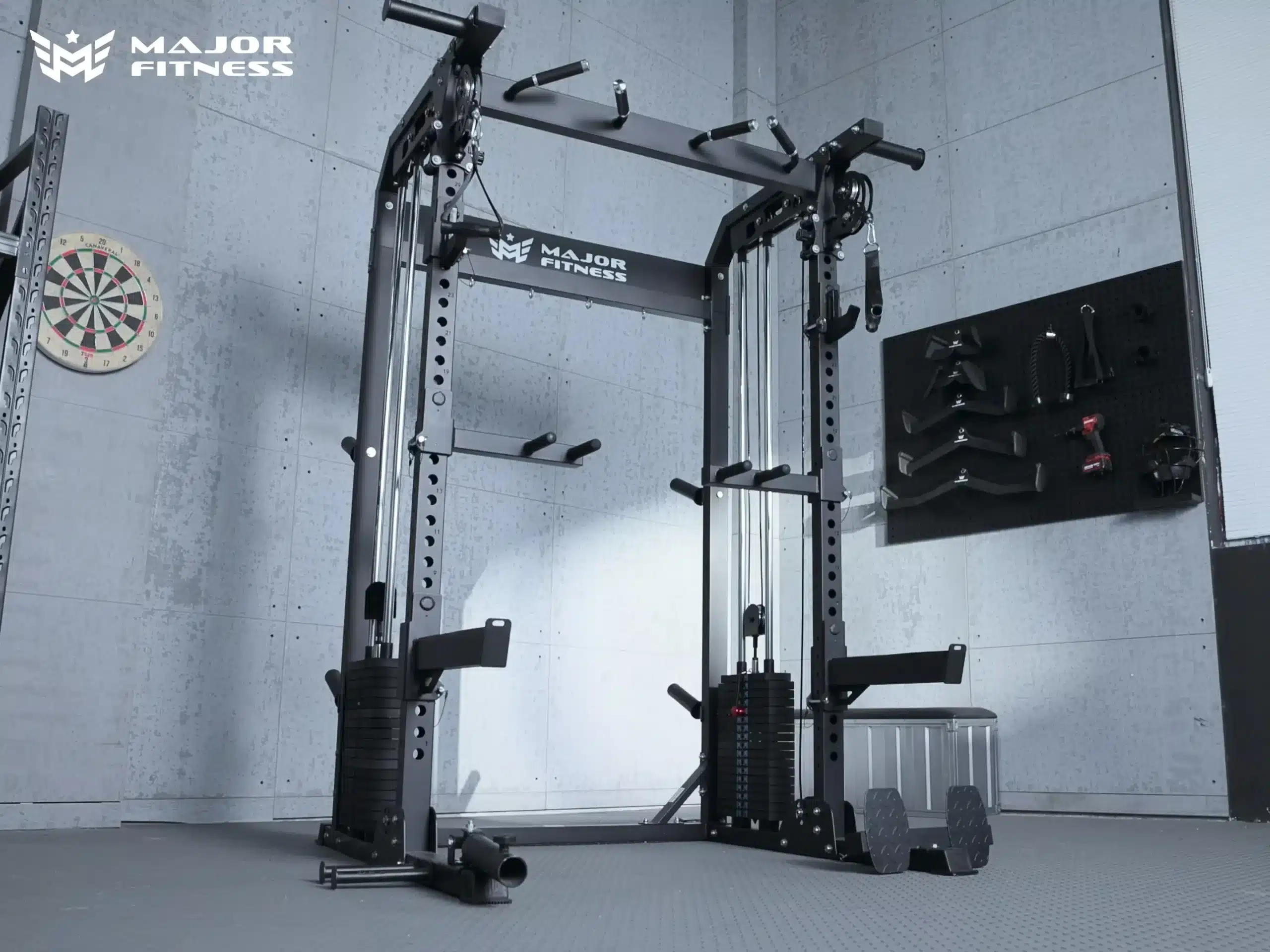 The Major Fitness F22 combines a Smith machine, power rack, and dual cable system in a single unit. It holds 1,000 pounds on J-hooks, 700 pounds on safety arms, and 300 pounds per cable side. That’s enough capacity for serious lifting with room to grow.
